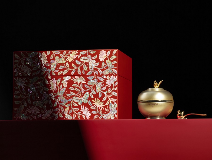 LG생활건강은 각국 정상에게 증정한 ‘국빈 세트’의 품격을 더후 환유고 APEC 리미티드 에디션에 그대로 담았다. 패키지로는 국빈 세트와 마찬가지로 서울특별시 무형유산 제1호 칠장 수곡(守谷) 손대현 장인이 손수 만든 주칠(朱漆·붉은 칠) 국화당초문 나전칠기함을 준비했다. 내용물로는 더후 브랜드의 하이엔드 안티에이징 크림인 ‘환유고’ 60ml와 봉황 스패출러를 구성했다.