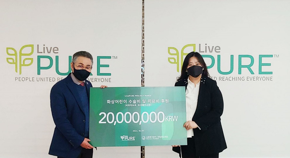 리브퓨어코리아는 오는 5월까지 총 2,000만 원을 한림화상재단에 기부할 예정이며, 1월 7일 1차 모금액 1,100만 원을 기부했다고 밝혔다.