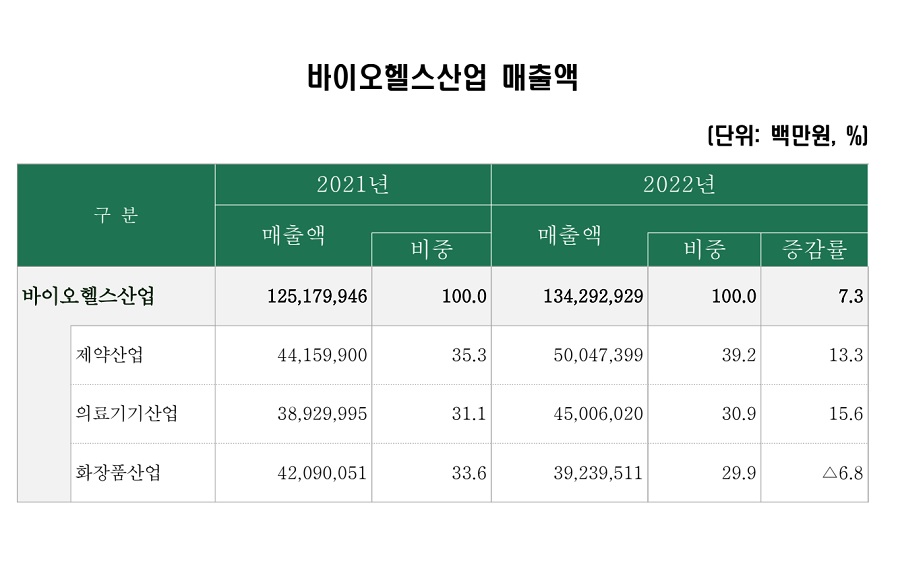 조사 결과 2022년 바이오헬스산업 매출은 전년 대비 7.3% 증가한 134조 2,929억 원을 기록했다. 산업별 매출규모는 제약 부문 매출이 50조 474억 원(+13.3%)으로 가장 많았으며, 이어서 의료기기 45조 60억 원(+15.6%), 화장품 39조 2,395억 원(-6.8%) 순이었다.