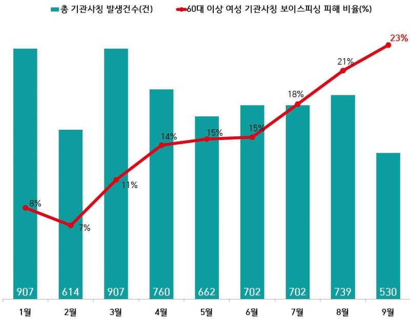 이 때문에 전체 기관사칭형 피해 건수 중에서 1억 원 이상의 다액 피해 건수도 전년도 같은 기간 대비 172% 증가한 763건이 발생했다. 고령층 중에서도 특히 60대 이상 여성 피해자 비중이 높다.