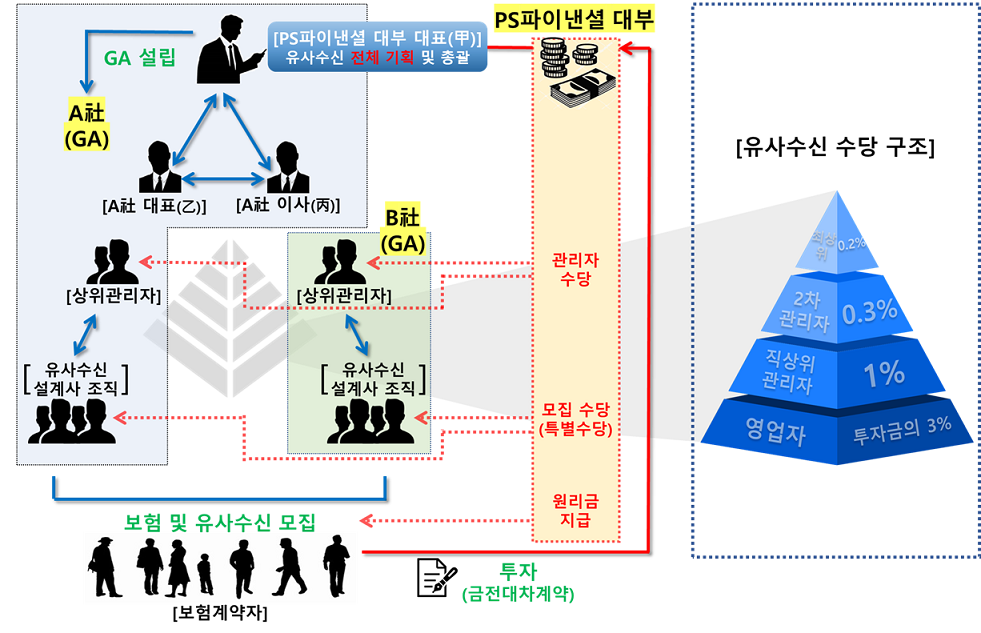 1,400억 원 대의 유사수신 행위를 저지른 보험대리점(GA) 2곳이 금융 당국에 적발됐다. 금융감독원(원장 이복현, 이하 금감원)은 해당 GA와 대부업체 간의 조직적 공모, 보험설계사들의 유사수신 투자 권유, 내부통제 부재 등을 확인하고 중징계 및 형사고발 등 엄정 대응에 나설 계획이다. 금감원은 최근 보험설계사들이 대부업체와 연계해 유사수신에 가담했다는 언론보도에 따라 A사와 B사를 상대로 지난해 12월부터 올해 2월까지 긴급 현장검사를 실시했다. 검사 결과, 두 GA 소속 설계사 97명이 총 765명의 보험계약자를 상대로 약 1,406억 원의 투자금을 모집했고, 이 중 342억 원은 현재까지 상환되지 않은 것으로 확인됐다. ▷ GA-대부업체 연계 유사수신 체계(사진: 금융감독원) 특히 A사는 보험설계사 출신 대부업체 대표가 직접 설립한 GA로, 대부업체에서 230억 원 이상의 운영자금을 투입한 정황도 드러났다. 이 GA는 지점장과 설계사로 구성된 4단계 피라미드 구조를 활용해 자금을 모집하고, 고객 자금의 예치 기간에 따라 설계사와 관리자에게 고액의 수수료를 지급하는 체계를 운영해왔다. 설계사들은 ‘월 50% 수익률 보장’ 등 과도한 수익률을 약속하며 SNS 광고, 재무설계 상담 등을 통해 사회초년생이나 일반 보험고객에게 접근했다. 고객은 대부업체 대표 개인 명의 계좌로 자금을 송금했고, 실제 계약은 ‘금전대차 계약’ 형식을 띠며 투자자 보호장치가 없었다. 그러나 상품설명서에는 “원금 및 수익은 대부업체가 보장”이라는 문구가 포함돼 있어 허위광고의 정황도 확인됐다. B사 역시 SNS 광고를 통해 고객을 모집했으며, 수년간 무단 광고가 이어졌음에도 내부 통제 장치가 제대로 작동하지 않아 피해가 확산됐다. A사는 준법감시인을 선임하지 않은 것으로 드러났다. 금감원은 “대부업체와 GA가 사실상 하나의 사업체처럼 움직이며 보험영업을 가장한 불법 유사수신을 벌였다”며 “GA의 보험수수료까지 대부업체에 유용하는 등 자금 돌려막기 형태의 폰지사기 양상까지 드러났다”고 밝혔다. 아울러 “보험설계사 신분을 이용해 고객 정보를 악용하고 고수익 투자 권유를 일삼은 사례에 대해서는 무거운 인적 제재를 검토 중”이라고 덧붙였다.