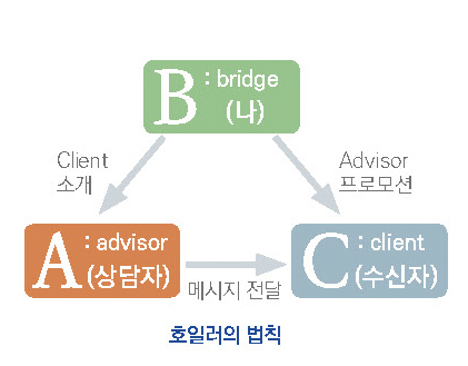 2) ‘호일러의 법칙’ 활용하기 네트워크 마케팅의 리크루팅 현장에는 세 명의 사람이 존재한다. 이를 A, B, C라고 소개 프로모션 정의한다면 A는 그 분야의 전문가 또는 성공한 사람으로 우리는 이를 스폰서라고 부른다. B는 C를 초대한 초대자이다. C는 잠재 사업자라고 정의하자. ‘호일러의 법칙’에 따르면 C(잠재 사업자)를 만날 때 B(초대자)가 혼자 만나는 것보다 설명을 도와줄 수 있는 전문가인 A(스폰서)와 함께 만나면 훨씬 효율적으로 사업을 전달할 수 있다고 한다. 제3자 입장에서 객관성과 전문성을 내세우기 때문에 현장에서도 훨씬 리크루팅 확률이 높아진다. ‘호일러의 법칙’을 다른 말로는 ‘ABC의 법칙’이라고도 한다.