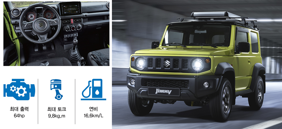 스즈키 짐니 - 일본의 소형 G-wagon 일본의 소형 지바겐으로 불리는 스즈키의 짐니는 작은 차체임에도 디자인에서 주는 웅장함에 그 매력이 돋보인다. 무려 20년만에 풀 체인지된 4세대 짐니는 3기통 인터쿨러터보 가솔린 엔진을 사용하며, 배기량 658cc, 최대 토크 9.8kg.m, 최대 출력 64마력의 경형 SUV 차량이다. 연비는 16.6km/L로 준수한 연비성능을 보여주며 40L의 연료탱크로 부족하지 않은 주행을 할 수 있다. 전작에 비해 출력과 토크가 상향되었지만, 차체도 더 커지는 바람에 높아진 파워트레인의 힘을 실감하지 못할 수 있다. 하지만 짐니를 구매하는 소비자들은 파워트레인보다 각진 박스차 디자인을 더 선호하여 구매하는 경우가 대다수다. 최근 국내외 소비자들이 소형 지바겐처럼 꾸미는 영상이 SNS에 퍼지며 유명세를 얻은 짐니는 현재 병행 수입 업체를 통해서만 구매가 가능하다. 병행 수입을 하게 된다면, 스티어링 휠이 우측에 위치한다는 단점이 있어, 우측통행이 일상화된 한국에서는 더욱 큰 불편함으로 다가온다. 하지만 이 ‘소형 G-wagon’을 소유하기 위한 소비자들에게는 이같은 단점도 특별한 포인트로 보인다는 후문이다.