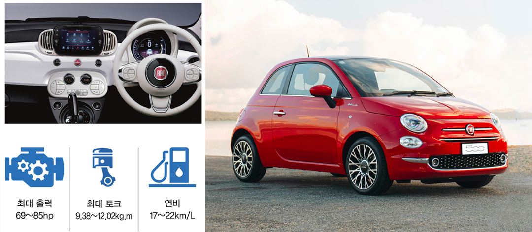 피아트 500 - 클래식 중의 클래식 경차 1957년 이탈리아에서 탄생한 전설적인 경차인 피아트 500은 클래식한 디자인으로 전 세계에서 사랑받고 있다. 작은 사이즈이지만, 감각적인 클래식 디자인, 높은 연비와 개성 있는 컬러 옵션 등으로 젊은층과 여성 운전자들 사이에서 큰 인기를 끌고 있다. 현재 친환경차 트렌드로 인해 피아트는 지난 2021년부터 내연기관 대신 전기차 버전인 ‘피아트 500e’만 공식 판매 중이다. 역사속으로 사라진 내연기관의 피아트 500은 클래식카를 좋아하는 사람들 사이에서 중고 거래 등으로 유통되고 있다. 한국에서는 2019년부터 공식 수입이 중단되어, 병행 수입 형태로만 거래가 가능하다. 피아트 500은 전장 3,571mm, 전폭 1,627mm의 작은 사이즈로 골목길 운전과 주차가 쉽다는 장점이 있으며, 짧은 휠베이스로 코너링과 안정성 및 좁은 공간 활용도가 우수하다. 연비는 복합 17~22km/L 수준으로 매우 경제적이고, 유지비 또한 저렴하다. 파워트레인은 가히 미니멀리즘이라고 평가할 수 있다. 1.0L의 3기통 가솔린 엔진이 기본 탑재되어 69마력, 최대 토크 9.38kg.m이다. 상위 트림에서는 마일드 하이브리드 시스템이 장착되어 최대 85마력, 최대 토크 12.02kg.m 수준이다. ▷ 가격: 약 1,371만 원