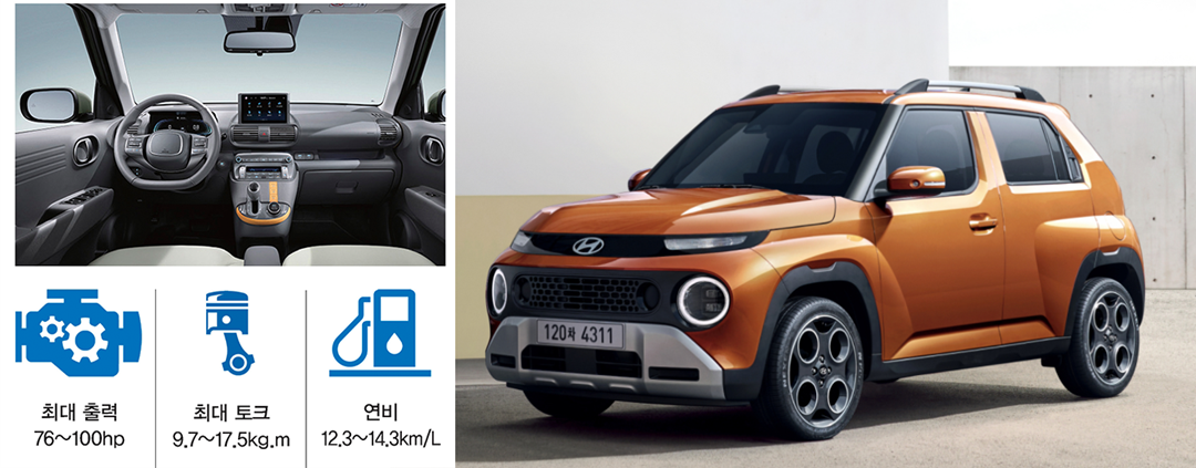 현대 캐스퍼 - 귀여운 디자인과 알찬 구성귀여운 디자인과 알찬 구성 최대 출력 100hp, 스마트스트림 가솔린 1.0 엔진에 최대 토크 9.7kg.m, 복합연비 14.3km/L(15인치 휠 기준)라는 아주 귀여운 스펙을 가진 이 차량은 바로 현대의 야심찬 소형자동차 캐스퍼다. 캐스퍼는 출시 당시 경형차임에도 SUV차량과 비슷한 디자인과 귀여운 헤드라이트로 많은 소비자들의 눈길을 끌었다. 10.25인치의 적절한 크기의 내비게이션 디스플레이와 차세대 TFT Color LCD가 적용된 슈퍼비전 클러스터로 주행 정보에 대한 시인성을 높였다. 또한, 눈길, 진흙, 사막 지형 등에서 험로주행모드를 활성화하여 어느 곳에서나 자유롭게 주행할 수 있는 기능을 제공하며 타사의 소형차보다 더 강한 장점을 보인다. 그 외에도 전방 충돌방지 보조, 후측방 충돌방지, 차로 유지 보조, 내비게이션 기반 스마트 크루즈 컨트롤, 고속도로 주행보조, 후방 교차 충돌방지 보조 등 다양한 기능이 탑재되어 운전자의 주행을 보조해줌으로써 다양한 편의 기능을 제공한다. 낮은 출력 덕분에 평균 연비 14.3km/L라는 준수한 기록을 보여주어 차량 유지비용도 절감할 수 있는 경형 차량이다. 특히 귀여운 디자인 덕분에 여성 운전자들에게 많은 인기를 끌고 있다. ▷ 가격: 약 930만 원