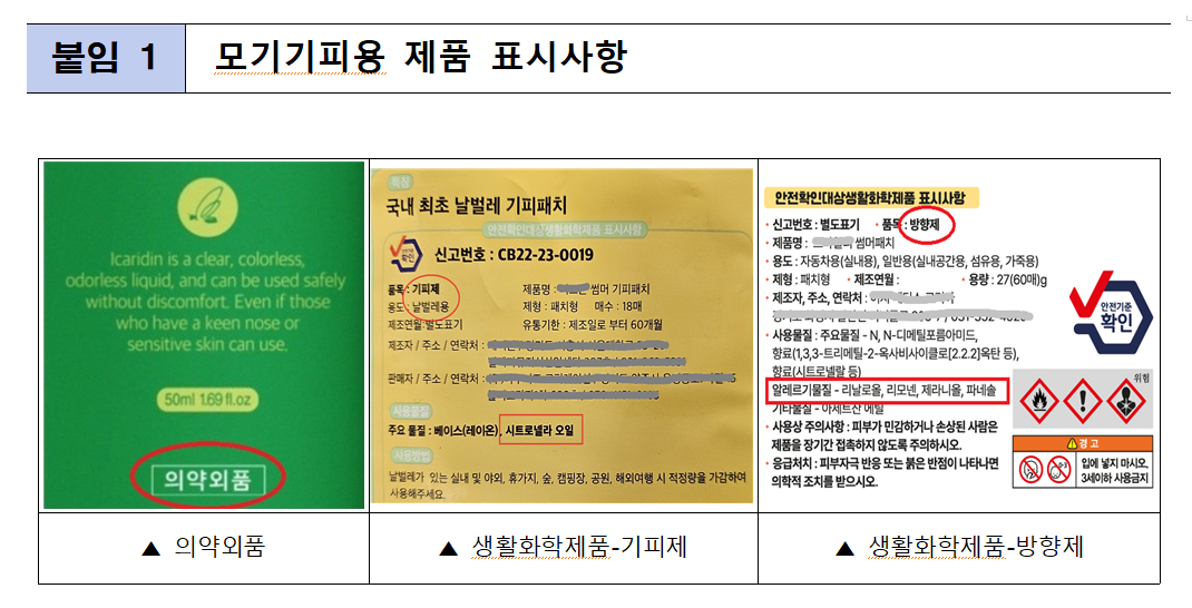 특히 ‘썸머패치’, ‘썸머밴드’ 등 명칭을 사용하는 일부 제품은 소비자가 의약외품으로 오인할 우려가 있는 것으로 조사됐다. 해당 제품의 주성분은 천연 정유 성분인 시트로넬라 오일인데, 안전성 근거 및 기피 효과 부족으로 2017년 이후 의약외품 허가 대상에서 제외된 성분이다.