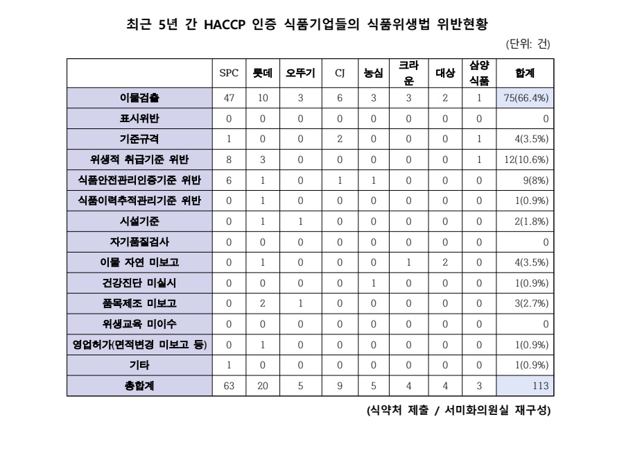 국회 보건복지위원회 서미화 의원(더불어민주당)이 식품의약품안전처로부터 제출받은 <식품위생법 위반 HACCP 인증 상위기업 현황> 에 따르면 ▲SPC( 삼립 · 샤니 · 파리크라상 · 비알코리아 등) ▲롯데(롯데웰푸드 · 롯데칠성음료 등) ▲CJ(CJ 제일제당 ·CJ 푸드빌 등) ▲오뚜기 ▲농심 ▲크라운 ▲대상 ▲삼양식품 등 해썹 인증을 받은 주요 식품기업들(계열사 포함) 8곳의 제조공장별 식품위생법 위반 건수는 2020년부터 지난해까지 총 113건에 달한 것으로 나타났다.
