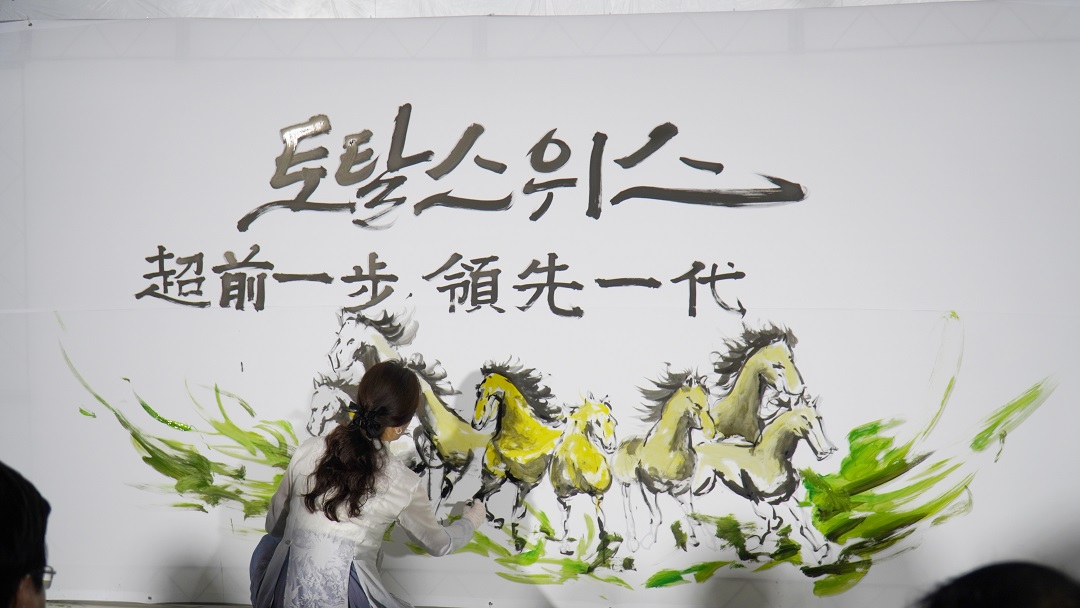 행사의 첫 순서는 한글의 아름다움을 세계에 알리고 글씨를 예술로 승화시키는 캘리그라퍼 이화선 작가의 퍼포먼스로 시작됐다. 이 작가는 토탈스위스의 사명(社名)과 회사를 상징하는 여덟 마리의 말(八馬) 그리고 남들보다 한 걸음 더 앞서가며 시대를 선도한다는 ‘초전일보(超前一步), 영선일대(領先一代)’라는 문구를 그려내며 큰 호응을 얻었다.