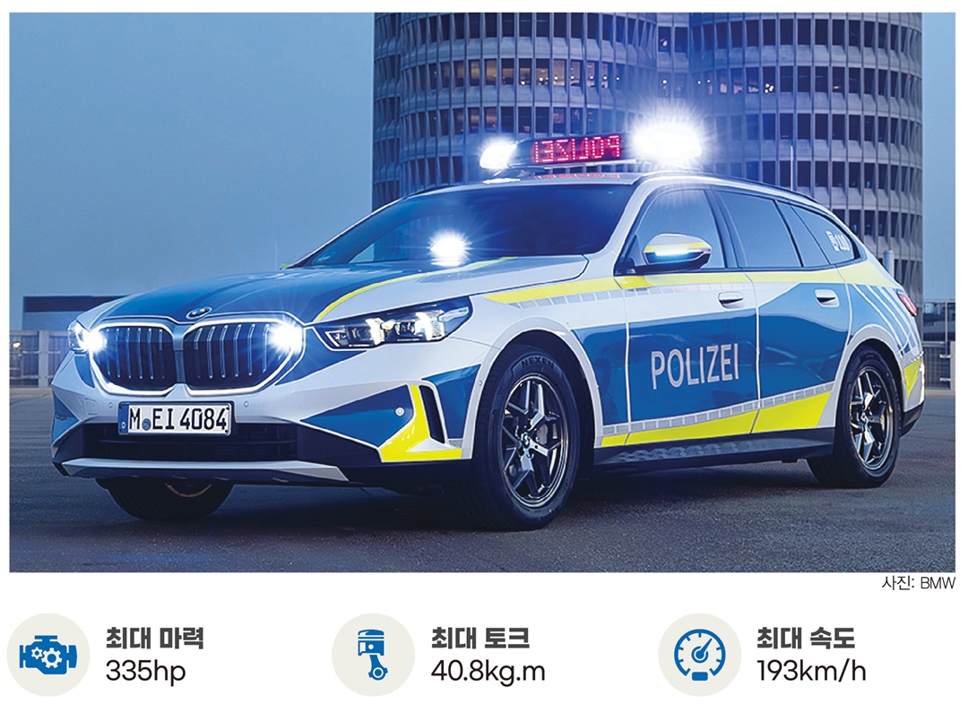 독일 경찰은 자국 브랜드인 BMW사의 i5 eDrive40 투어링 모델을 새로운 전기 경찰차로 선보였다. 바이에른 경찰은 약 8,500대의 차를 운용 중이며 이 중 절반 이상이 도심 속 민원을 해결하는 순찰차다. 해당 차량들을 우선적으로 전기 모델로 교체하고 순차적으로 나머지 차량들도 전동화 파워트레인을 도입한다는 계획이다.