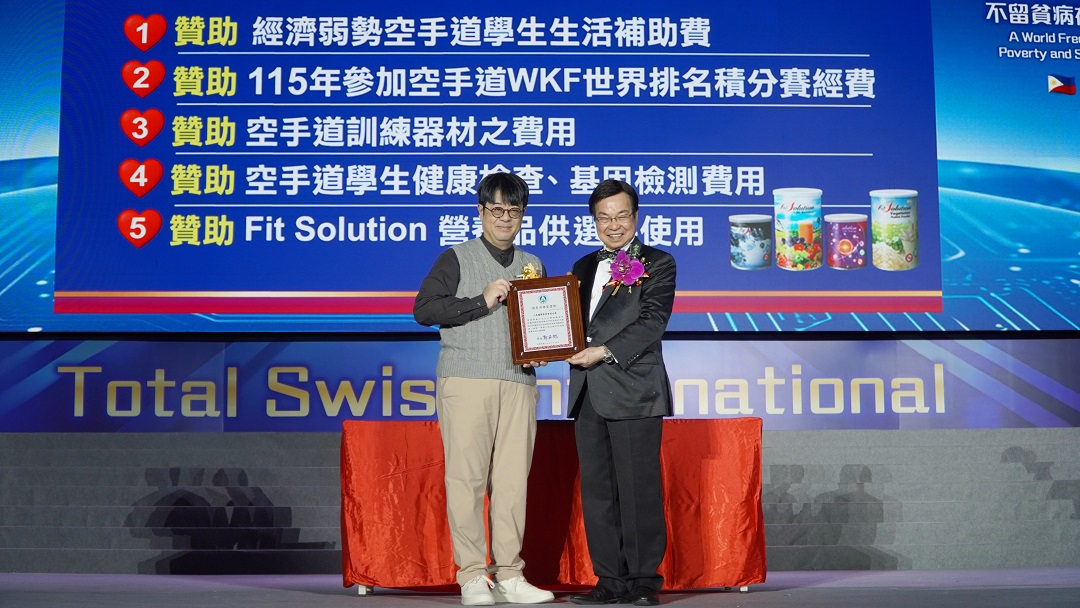 이후 왕웬친 회장과 타이베이시립대학교 츄인하오 총장이 토탈스위스의 가라테팀 후원협약식을 진행했다. 츄인하오 총장은 왕웬친 회장에게 교육 기부상을 전달하며 “왕 박사의 스포츠 교육 지원은 숫자 이상의 의미를 가진 사회 환원의 모범”이라며 “성공한 사람은 누구나 사회에 환원해야 한다는 것을 기억해야 한다. 왕 박사의 사회 공헌과 관심에 감사드린다”고 말했다.