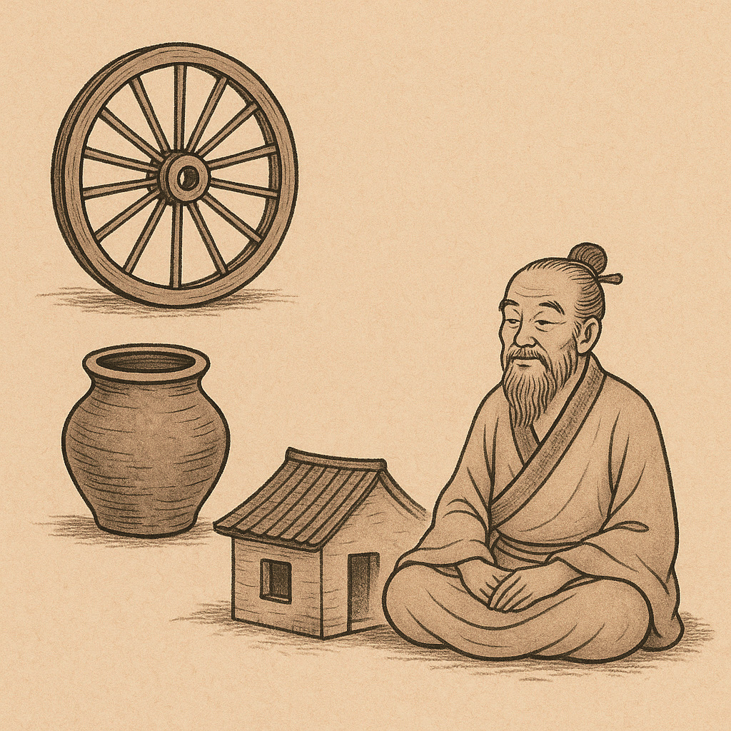 『도덕경』 제11장(第十一章) 三十輻 共一轂(삼십복 공일곡): 서른 개의 바퀴살이 한 곳으로 모인다. 當其無 有車之用(당기무 유거지용): 그것이 없음에 수레의 쓰임이 있다. 埏埴以爲器(연식이위기): 진흙을 이겨 그릇을 만든다. 當其無 有器之用(당기무 유기지용): 그것의 없음에 그릇의 쓰임이 있다. 鑿戶牖以爲室(착호유이위실): 문과 창문을 뚫어 방을 만든다. 當其無 有室之用(당기무 유실지용): 그것의 없음에 방의 쓰임이 있다. 故有之以爲利(고유지이위리): 그러므로 있음의 이로움은 無之以爲用(무지이위용): 없음의 쓰임새에 있다.