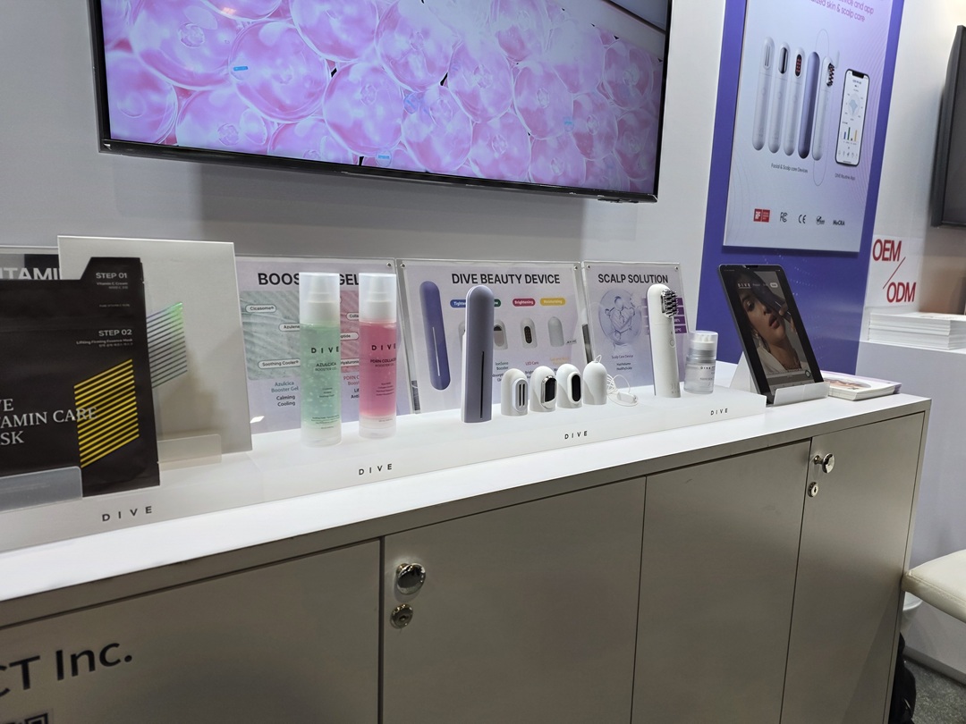 성남시에서는 약 30개 업체가 참가했다. 전시관은 헬스케어·바이오, AI·빅데이터, 스마트 디바이스, 로봇공학·반도체 및 부품 등 4개 섹션으로 구성돼 관람객이 관심 분야를 집중적으로 살펴볼 수 있도록 했다. 그중 헬스케어&바이오 섹션에 전시된 업체 ACT Inc.는 하나의 본체에 키트를 교체하면서 사용 가능한 뷰티 디바이스 DIVE를 선보였다. 얼굴용 4종과 두피용 신규 키트가 추가돼 총 5종의 탭을 교체해 사용할 수 있는 구조로, 용도에 따라 활용할 수 있는 점이 주목을 받았다.