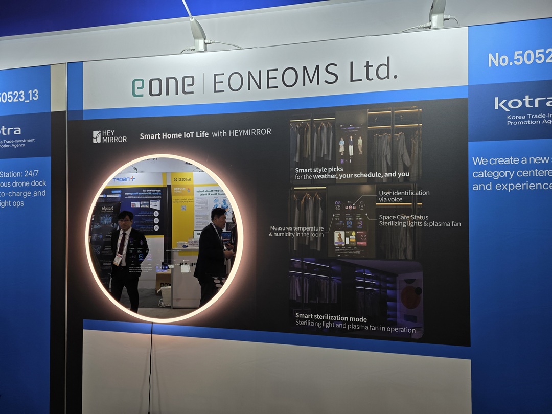 전시장에서는 이원OMS의 스마트 홈 서비스 ‘헤이 미러’도 관람객의 관심을 끌었다. AI와 스크린이 탑재된 거울을 통해 다양한 정보를 확인할 수 있으며, 전용 애플리케이션에 의류 사진을 저장하면 3D AI 모델이나 사용자의 모습을 3D로 구현해 드레스 코디를 미리 확인할 수 있다.