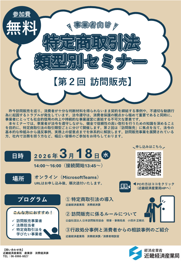 일본 긴키경제산업국은 ‘특정상거래법 유형별 세미나’를 오는 3월 18일 온라인으로 개최한다고 밝혔다.