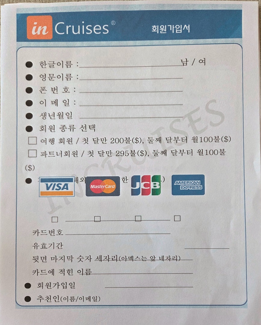 ▷ 인크루즈 회원가입서 국내에서 불법 영업 의혹을 받는 인크루즈 모집책에 대한 경찰 수사가 시작됐다. 크루즈 여행을 목적으로 해당 업체의 여행 상품을 구매한 소비자들이 수백만 원을 지불하고도 환불을 받지 못했다는 피해 신고가 접수되면서다. 앞서 MWR라이프에 이어 여행 다단계와 관련한 문제가 연쇄적으로 불거지면서, 국내에서는 책임 주체가 불분명한 불법 여행 다단계의 피해가 반복될 수 있다는 우려가 커지고 있다.