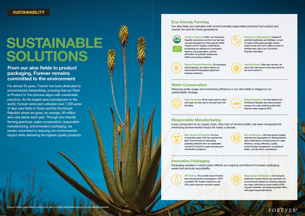 미국 텍사스와 도미니카공화국에 위치한 약 900만 평 규모의 알로에 베라 농장에는 약 5,000만 그루의 알로에가 재배되고 있으며, 이를 통해 이산화탄소 흡수와 수억 톤의 산소 생산에 기여하고 있다. 여기에 태양열 펌프, 물 재활용 시스템, 유기 퇴비 활용, 자연 제초 방식 등 친환경 농법을 통해 자원 절약과 탄소 배출 저감을 동시에 실현하고 있다.